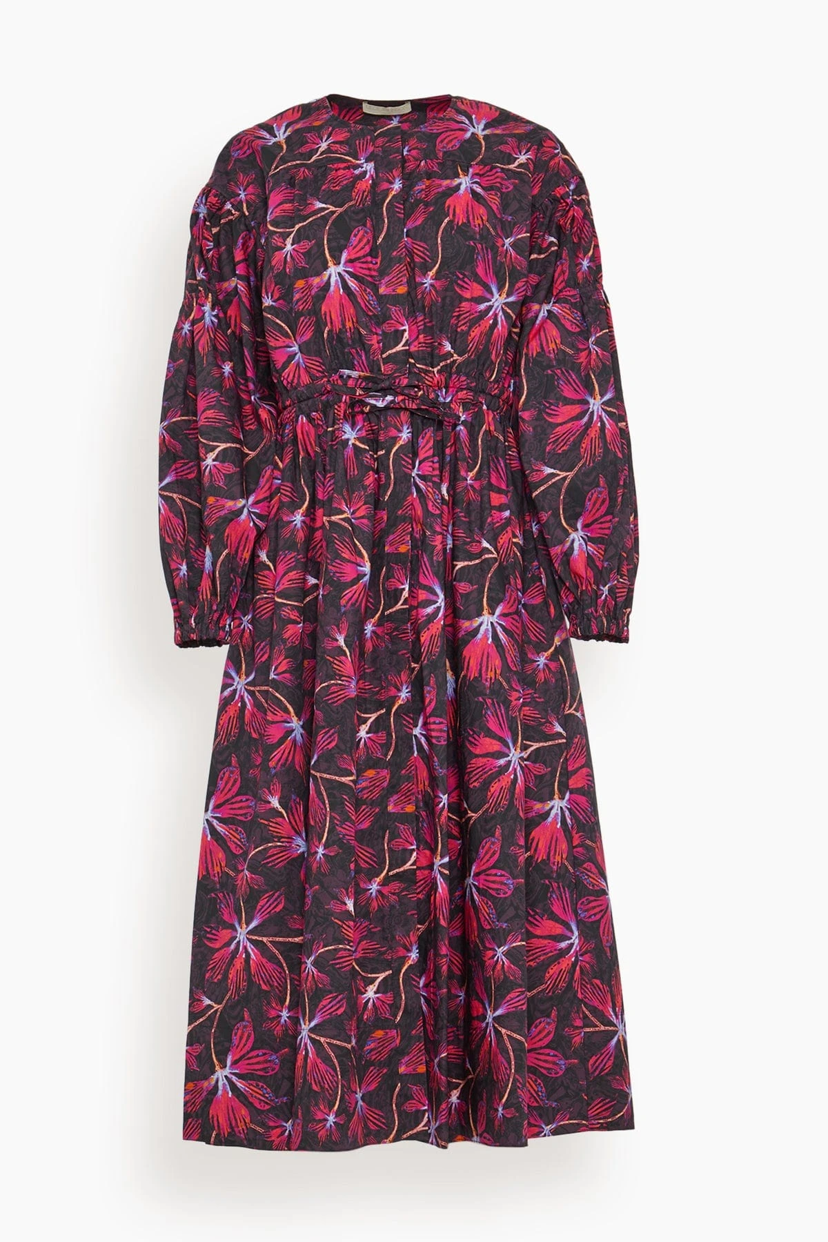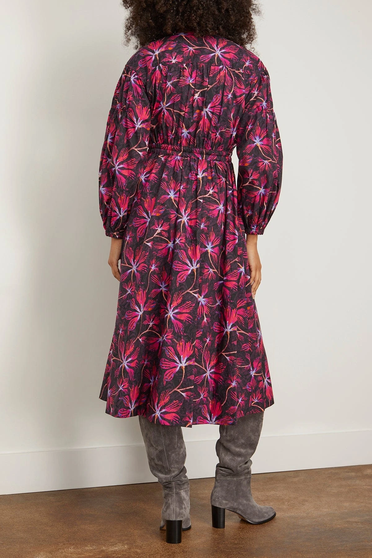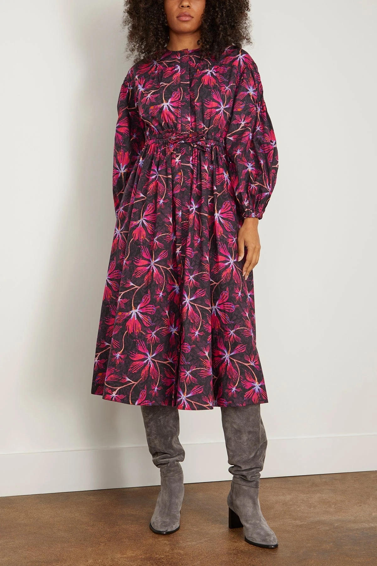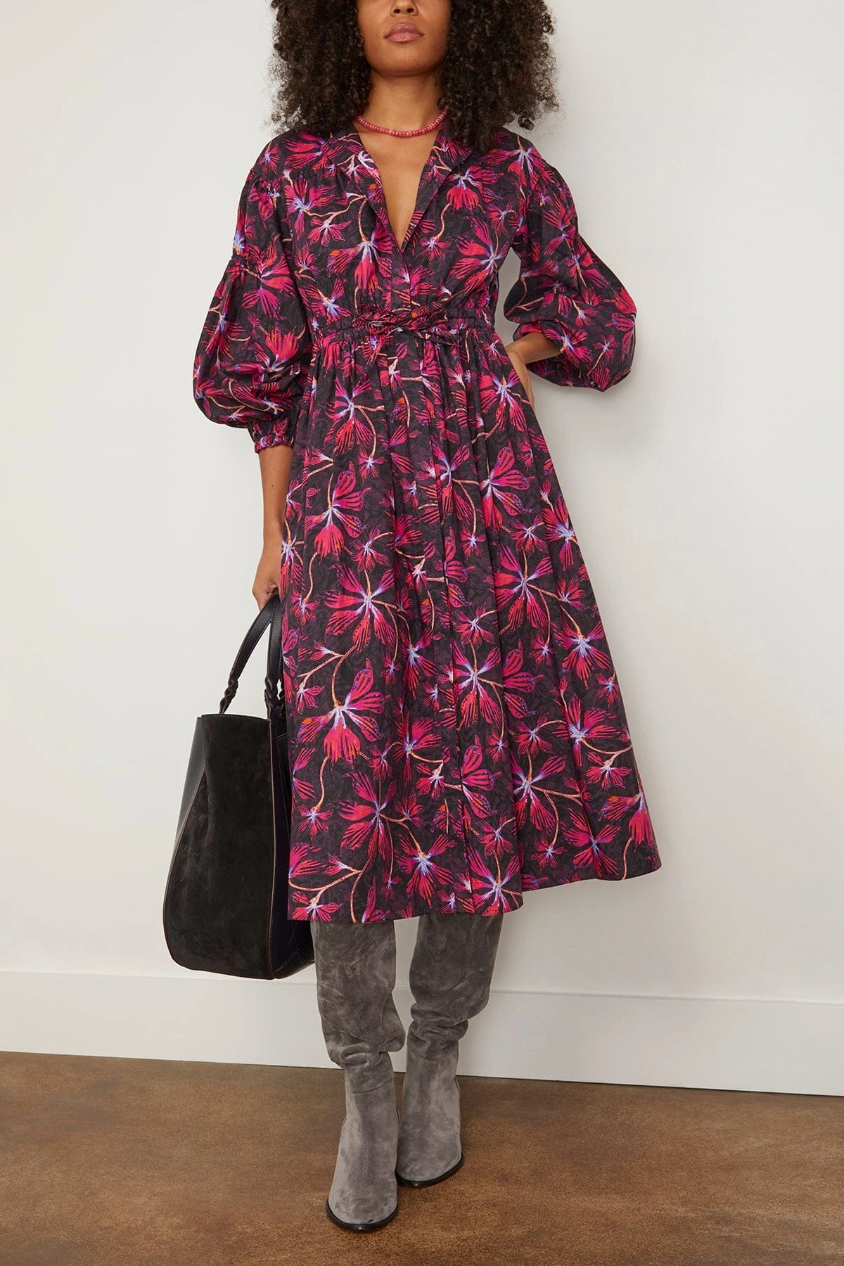 The Ulla Johnson Adalie Dress in Zinnia is made from crisp cotton poplin thats beautifully saturated with surreal magenta and hyacinth-hued blooms against a swirling background. This vibrant midi dress boasts long billowing sleeves, side slit pockets, and drawstring waist ties you can adjust for a cinched look. It is finished with a concealed button-front closure. We love it paired with a casual heel and a tote.
