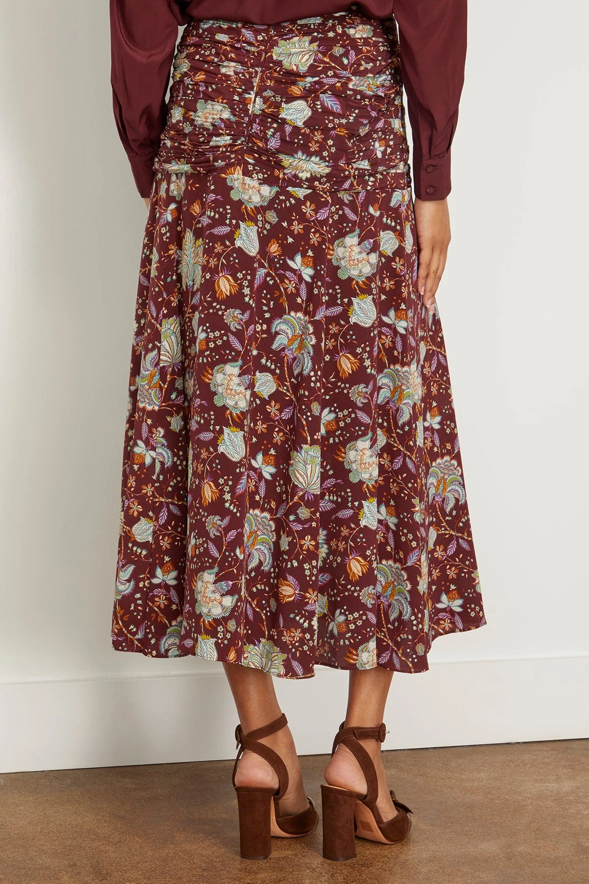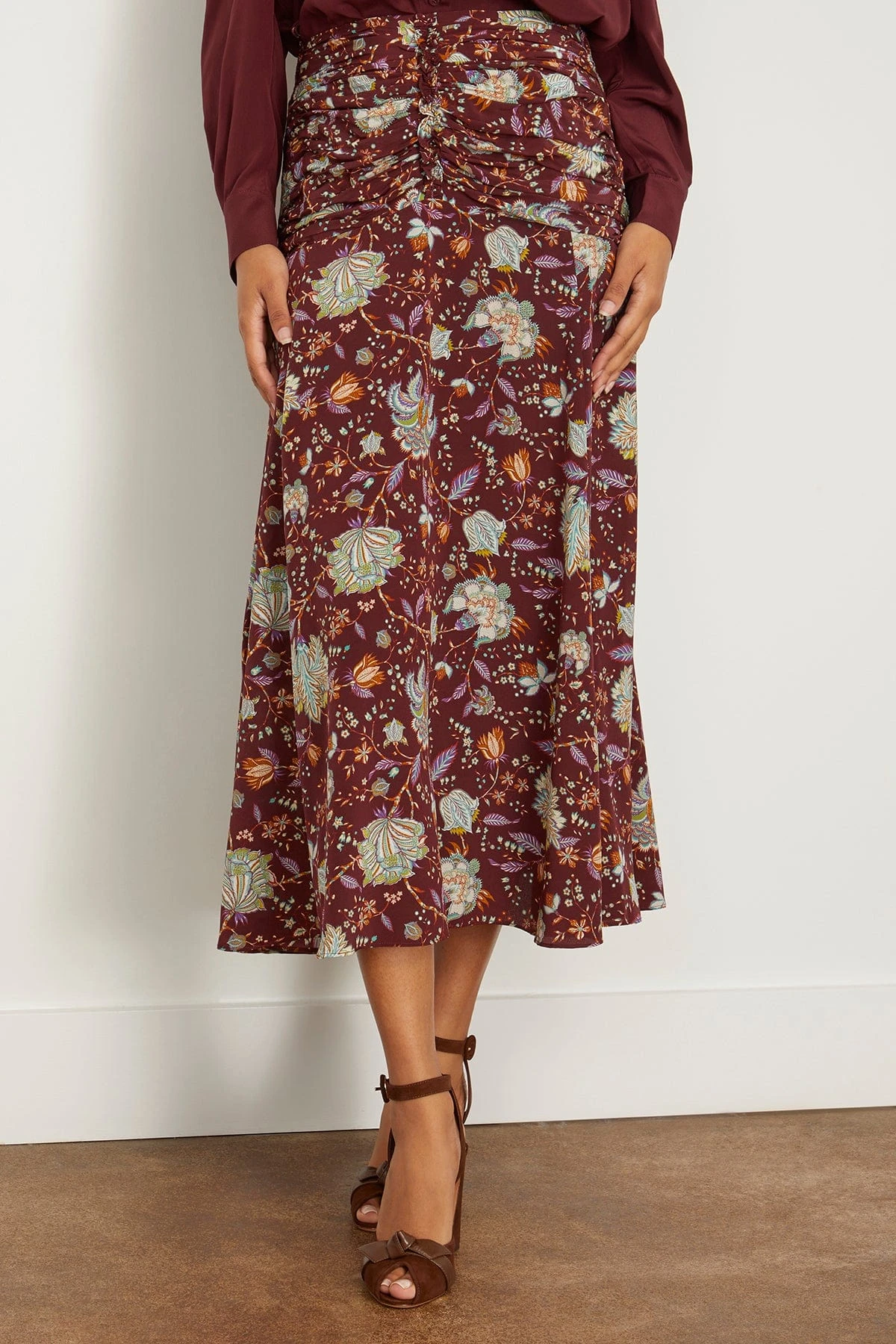 The Ulla Johnson Imani Skirtin Heliotrope is an ultra-elegant silhouette crafted from our lustrous silk crepe de chine. This gorgeous deep red floral midi skirt has graceful ruching and delicate ruffles that define the flattering high waist. We love it paired with a sweater and boots.