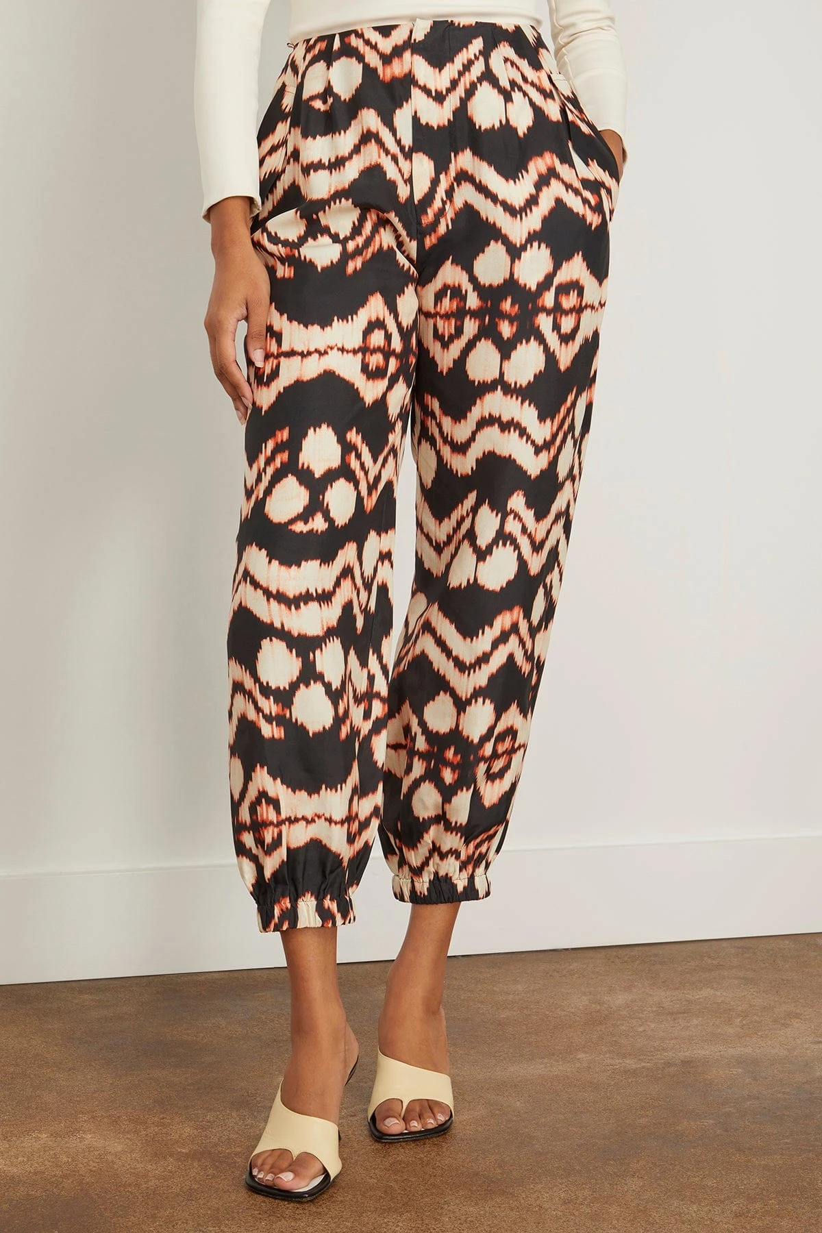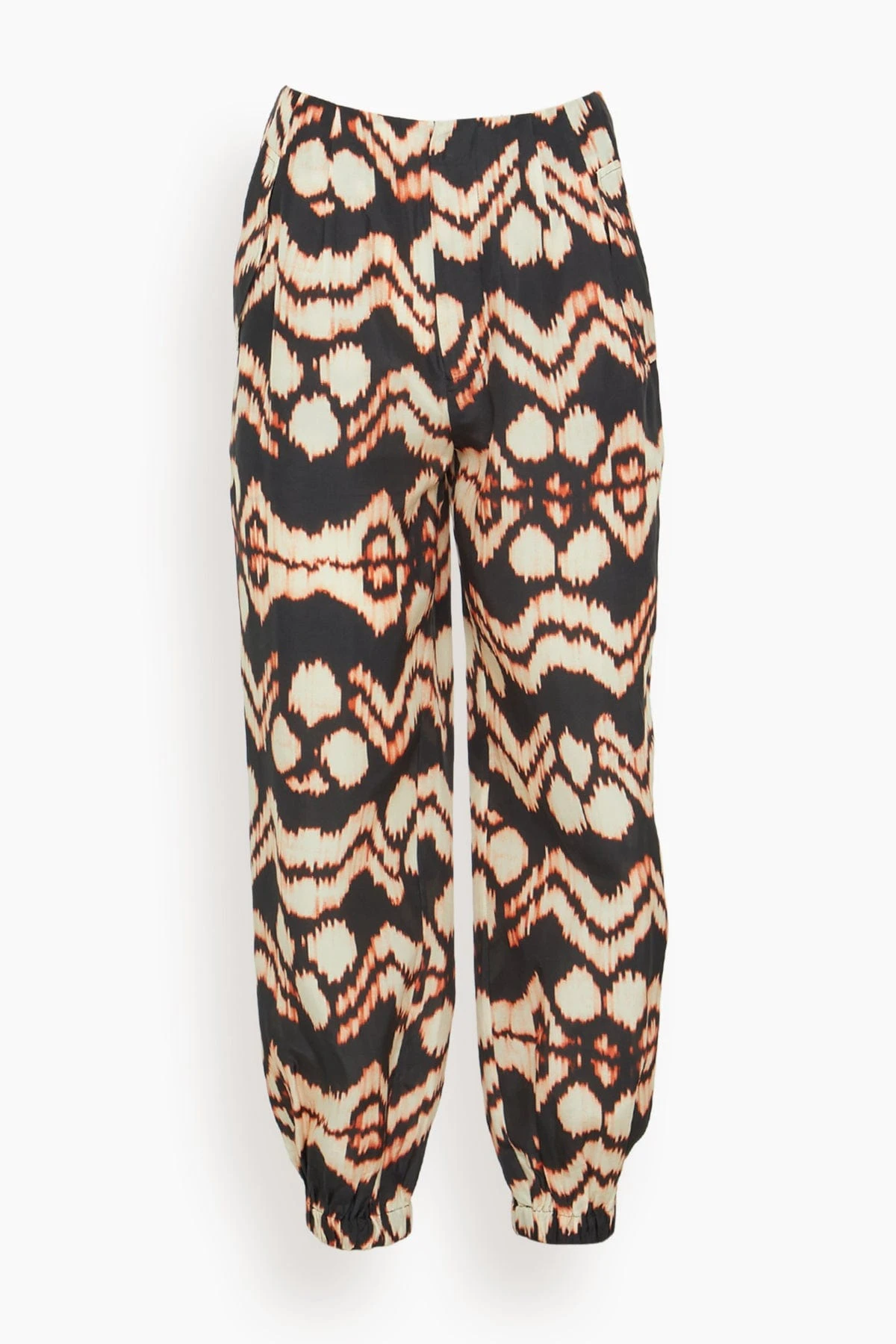 The Ulla Johnson Lucinda Pant in Obsidian is made from crisp taffeta in our standout ikat motif with vibrant cream graphics set against a black background. These pants are lightly pleated at the waist, have side seam and back flap pockets, and are elasticated at the cuffs to create a beautiful, tapered silhouette. We love it paired with the matching top and a tote.