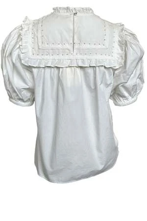 This blouse by Ulla Johnson features a short-sleeve, detailed with ruffles, French knots, and is embroidered by hand.
