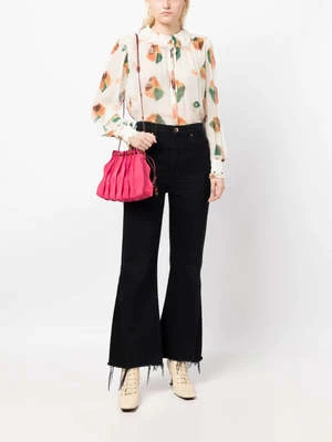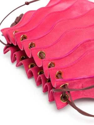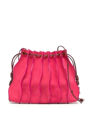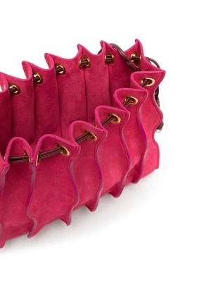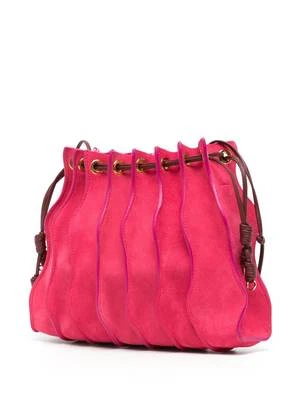 As featured in Look 5 of Ulla Johnson’s Pre-Fall ’23 Lookbook, the Adria Small Pleated Wave Bag is a gorgeous new addition to their handbag collection, defined by undulating seams that adorn its sumptuous leather exterior in a pink colorblock. This crossbody bag features a drawstring opening and is finished with shiny brass detailing.