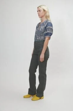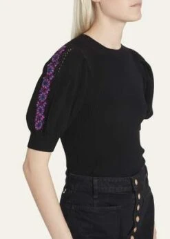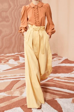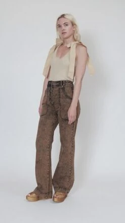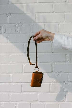 This wallet by Ulla Johnson features a hammered ring on the side with a leather lanyard attached, twill interior, and card slots, finished with a shiny brass snap closure.