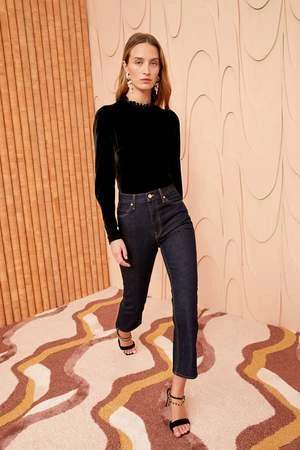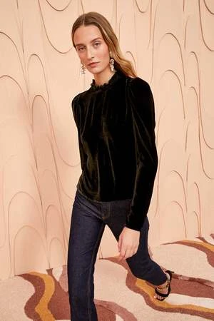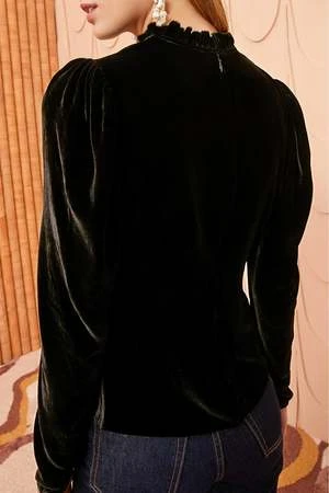 The Marlene Top is crafted from a liquid velvet fabrication thats blended with silk for an ultra luxurious hand. This classic noir top features ruffles that adorn the neckline and has long sleeves with a signature puff shoulders. It fastens with a hidden center-back zipper.