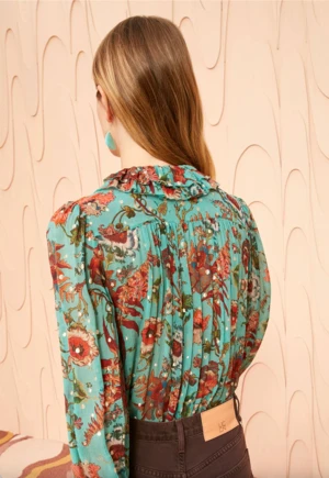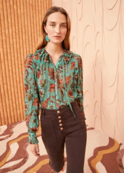 The Pippa Blouse is a best-selling silhouette from past seasons in crinkle chiffon with shimmering lurex and florals inspired by vintage French botanicals. This green-based, button-down top has a frilled collar, grosgrain neckline tie, and ruffled buttoned cuffs.
